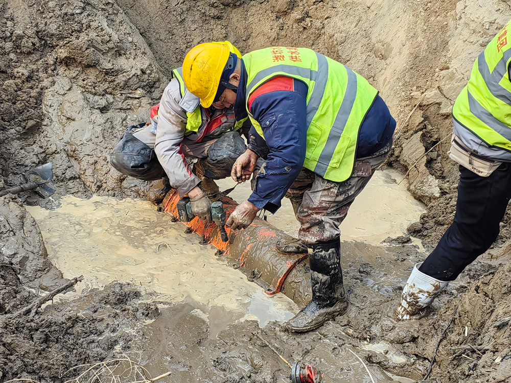 搶修現(xiàn)場(chǎng),因管線漏水導(dǎo)致路面塌方嚴(yán)重,確認(rèn)漏點(diǎn)后,搶修人員緊急制定搶修方案,同時(shí)給下游客戶(hù)下停水通知。受現(xiàn)場(chǎng)施工條件所限,挖掘機(jī)清理完上層堅(jiān)硬的砂石后,剩下的泥土只能用鐵锨一點(diǎn)點(diǎn)挖出。為縮短搶修時(shí)間,隊(duì)員們冒著零下8℃低溫天氣,全然不顧被泥水打濕的衣服和鞋子,站在冰冷刺骨的泥水里,徒手安裝螺栓。經(jīng)過(guò)5小時(shí)的連續(xù)奮戰(zhàn),最終比計(jì)劃時(shí)間提前4小時(shí)完成搶修,把因停水給居民帶來(lái)的影響降至最低,過(guò)往群眾紛紛為搶修隊(duì)員點(diǎn)贊。