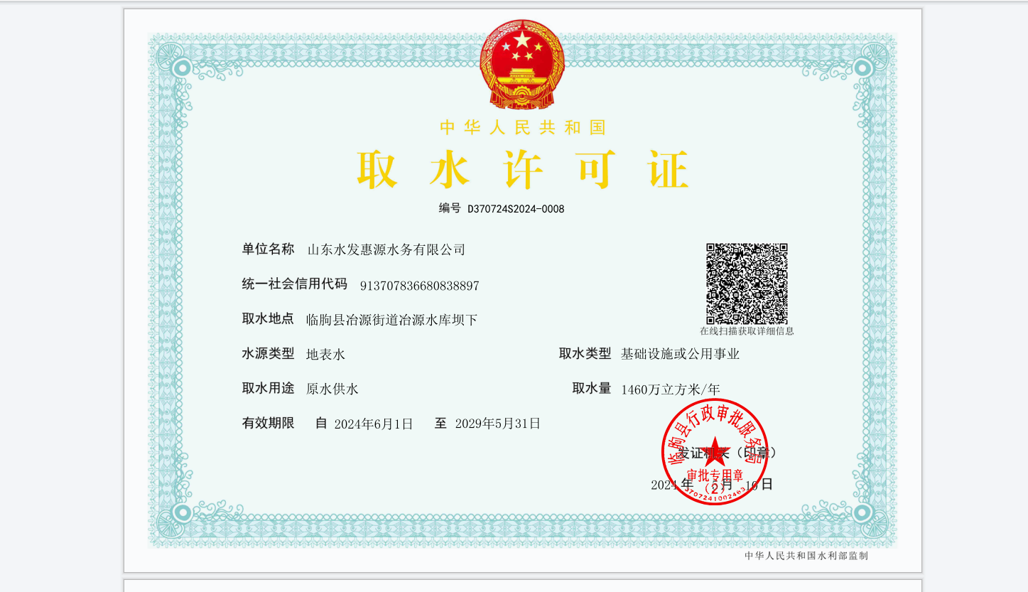 【惠源水務(wù)】山東水發(fā)惠源水務(wù)有限公司順利完成取水許可延續(xù)工作